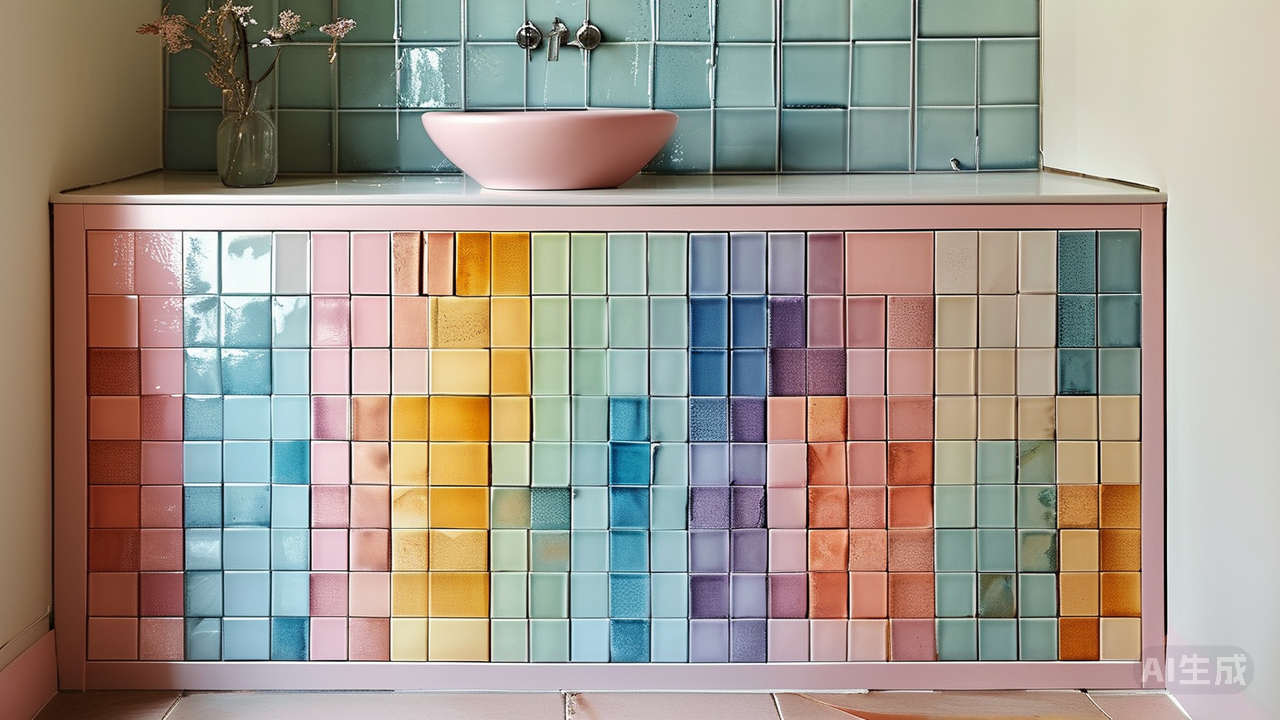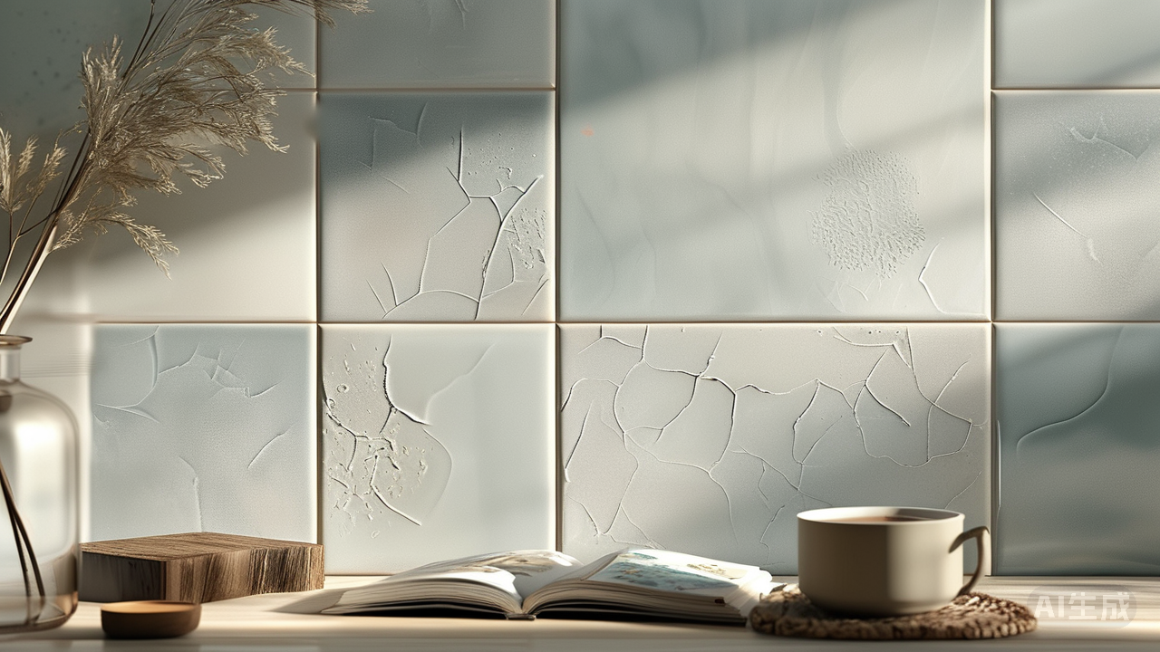 瓷砖的质地也参与着这温柔的对话。釉面哑光,仿佛覆着一层薄薄的晨霜,敛去所有刺目光泽,只留下温润触感。表面或带细微颗粒的肌理,或藏几不可察的细密冰裂,在光线流转下呈现如羊皮纸般的温厚质感。当窗外北欧的薄阳斜斜铺洒其上,这些微妙的肌理与柔和的色彩便一同低语,如同被森林晨曦吻过的童话小屋,既保有北欧风骨中的澄净,又因那温厚的触感而倍添亲近。