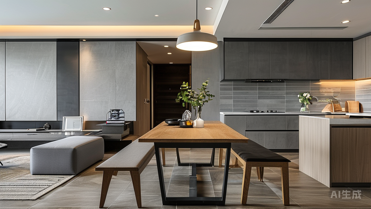 随后,纹理与尺寸的微妙变化即成为轻柔的变奏曲。客厅区大尺寸方砖沉稳铺开,餐厅区则悄悄转为修长条砖纵向伸展。那纵向的线条如无声向导,视觉上悄悄牵引着餐厅空间独立出来,同时为整体地面带来无声的节奏律动。又或者,以同款瓷砖为底色,在餐厅区域地面中央,悄然嵌入几块特殊纹理或色彩的砖块,仿佛地毯般自然界定出用餐的温馨中心,却无一丝生硬的割裂感。 至于过渡,则需如行云流水般不着痕迹。在客餐相接的模糊地带,可尝试将瓷砖拼贴方向缓慢倾斜,让空间边界在不知不觉中流动渐变,如溪流汇入湖中那般自然。或是在餐厅边缘嵌入一两道细细的金属条,这微光闪烁的线条在灯光下偶尔暗示着边界的存在,却绝无生硬割裂的蛮横感。