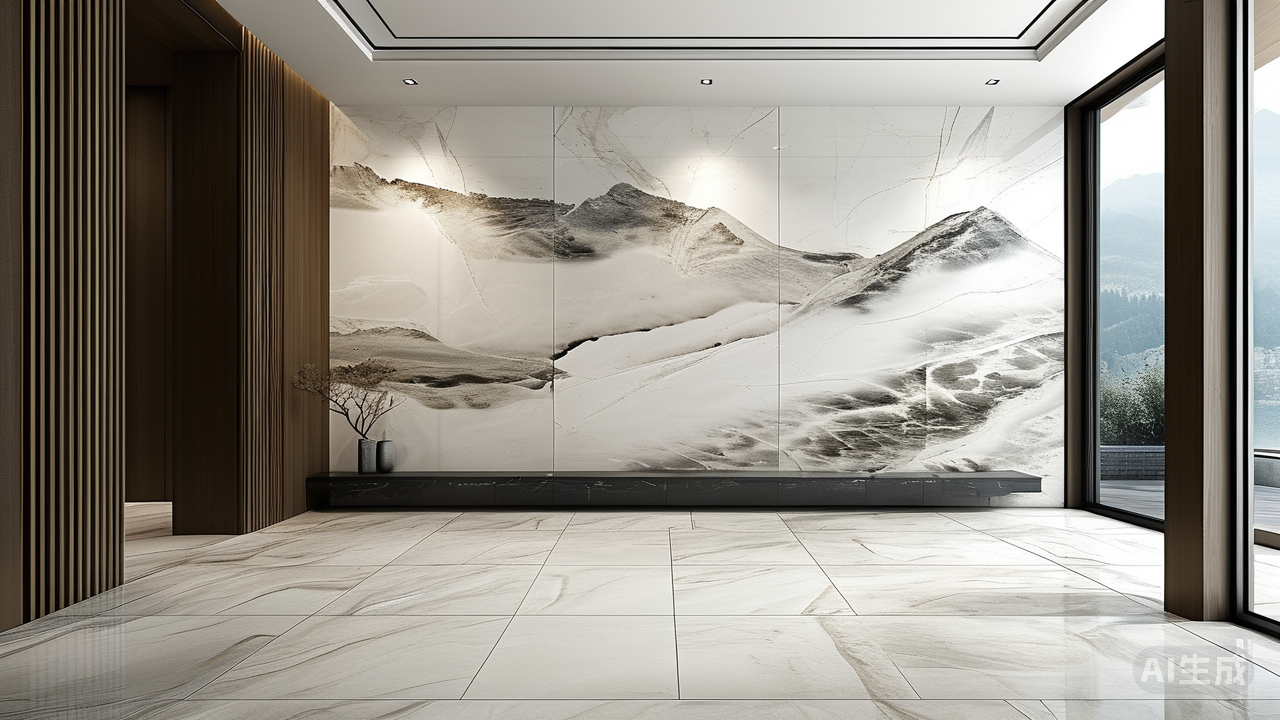 磅礴大气的纹理张力 大板瓷砖的另一个优势在于其能够完整展现天然石材的肌理与脉络。一幅壮丽的山水墨韵、一道深邃的卡拉拉白纹路,得以在超大尺幅的板面上肆意挥洒,纹理连贯且富有张力。这种完整的艺术表达,将大自然的鬼斧神工引入室内,仿佛将山川河岳的磅礴气象凝练于方寸之间,奠定了空间沉稳而大气的基调。